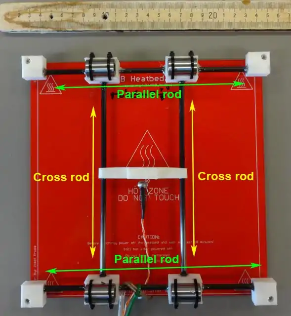 Properly spaced cross rods. - Insert the guide rods into the LM8UU bearings and again align saddles, ensuring that the guide rods are parallel with the parallel carbon fiber rods.