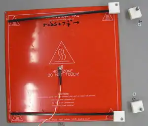- Push the epoxy-wetted parts together and attach the corner pieces to the heated build platform assuring that the platform is sandwiched between washers and nuts. Finger-tighten the nuts.