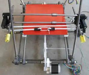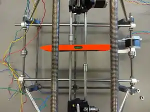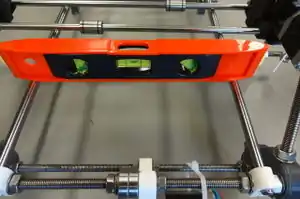 . - Put a piece of flat material on the Y-axis smooth rods and check the x axis to be horizontal with the spirit level. Add paper to the feet as needed.