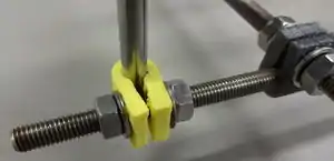 - Finally, put a clamp at the bottom of the bar with nuts and washers. Push the smooth rod through it. Don't tighten anything.