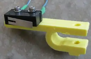 . - Attach the z-axis limit switch to its holder and then place the assembled end stop on the guide rod under the x-axis motor end. Insert an M3 nut and an M3 x 20mm screw into the end stop holder and tighten just enough to keep the holder in place on the guide rod. Don't worry about its height yet.