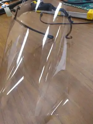 A frame with ability to hold a transparent semi-rigid sheet is printed using Lulzbot Taz6 printers with PLA and PETG fused filaments and then the transparent sheet is punched and glued to the frame making it a complete face shield covering the entire face of the person from forehead to under chin and is also curved to cover the sides.