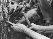 Notice the downward slope of the brace and bit. This aids the sap flowing out.