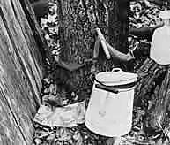 Though maple syrup production is usually associated with the New England states, the Ozarks have a number of wild, hard maples along the banks of its many streams and rivers. To supplement the family's need for sweetening, many Ozark farmers used to tap trees for their own use as Ella's father did and as she has continued to do almost every spring since. Some of her trees bear healed scars of tapping for the last fifty years. This tradition is older than American settlers for the Indians harvested the syrup before the white men came to the new world. Maple syrup is one of the few products produced solely in America.