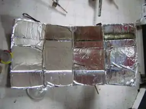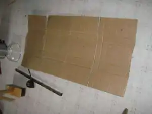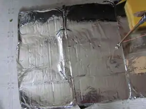 Each segment was 1 ft wide so I put 1ft kitchen foil across each segment and glued it. The glue mix was half Elmers glue and half water, mixed well and smeared lightly across the cardboard. I used a sponge to smooth on the foil. You start in the middle of a foil piece and sponge to the edges. It works well!