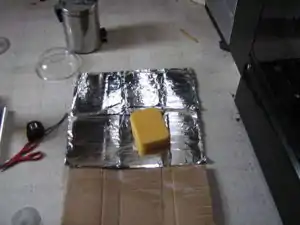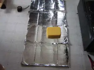 Your final product will have the focal length that you made. You can place and stick the cardboard from a toilet roll or something similar just under the focus to help you point it at the sun. Directly at means no shadows there. Generally, I place the food in a 9 inch glass or stoneware dish, put the lid on, and hang it in a metal hanging basket thing at the focus. I cover it all with an oven bag and clothespeg the top. If you want to make a tracking solar cooker, I suggest you move thecardboard cooker round the focus. The cooker is very light and there is no need to move the food too.