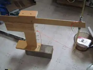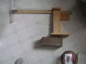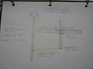 The mathematician can be made in many ways. Mine includes a piece of waste trim that is the slide bar at the top, a T-joiner for plastic pipes and a curtain rail that fit snugly into the T-Joiner. The string is strung from a hook on the central post at your favoured focal point, through a hole in the curtain rod and is tied on to the top of the T-Joiner. Some rules! The T-Joiner has to be at right angles to the slide bar which in turn must be at right angles to the central post. Directly under the hooks on the central post, there is a screw which goes down about a half inch through the bottom of the wood piece at the bottom of the post. And right under that screw, there is a hole in the dark piece of wood (just a little bigger than the screw). The dark piece of wood sits on the aluminum foil, screw goes in the hole and the top gadget can swivel around while the bottom piece stays in one spot. (This means less scuffing of the foil when the mathematician takes measurements!)