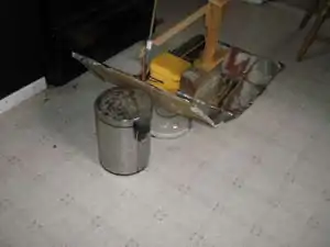 2. The string is attached at this end to the saddle. 3. The string passes freely through the eyehole near the tip 4. The string can be attached at any one of the black dots on the central post. Where it is attached coresponds to the focus of the finished parabolic mirror. |
