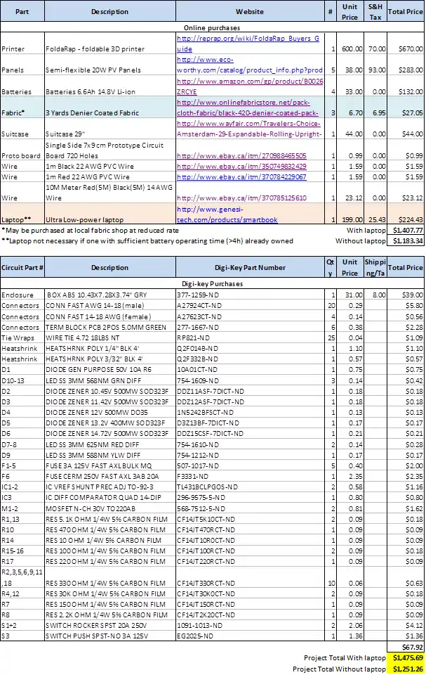 - Batteries and panels ordered. Still unsure of FoldaRap power consumption, so a power circuit was chosen that can run a 60W printer for 6.5h, or up to a 90W printer for 4.3h. Still much longer than the average 2h print.