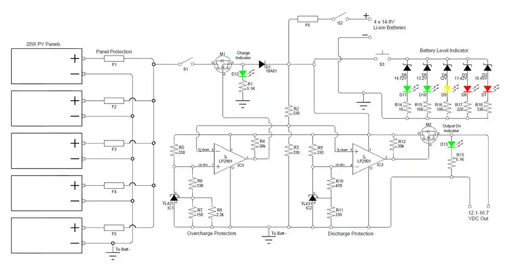 This is an charge controller circuit designed to charge 4 x 14.8V Li-ion Batteries from 5 20W PV Panels. The output can run any device that can run off 12-16.8VDC that draws less than 20A.