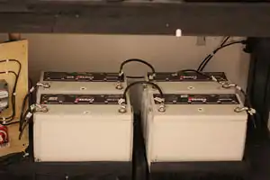 The batteries used for the project are sealed used in deep cycle applications and rated for 140 Amp hours. They are wired in series parallel to produce a capacity of 24Volts and 280 Amp hours. The terminals are connected together using 3 gauge wires with crimped lugs and bolt that attach to the battery. The positive and negative leads to the controller are taken from opposite corners of the bank to ensure that the energy flows through all cells equally to increase battery life. Each battery weighs approximately 120 pounds and must be situated on the cart so it is balanced evenly.