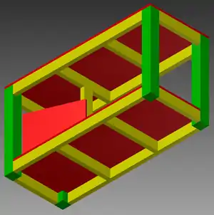 To build the same mobile charging cart, you will first need to obtain the supplies in the supply list. Start by building the actual cart. The dimensions of this cart are 24"x60"x31 3/4". Figure 19 shows a view of underneath the body of the cart, with the plywood in red, 4"x4"s in green, and 2"x4"s in yellow.