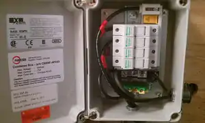 Each panel will be fused individually using a 4 pole combiner box which will also be used to connect the modules in parallel. The box used was made locally by FuseTek in Kingston, is CSA approved (See Figure 5.) The box has been rated for outdoor conditions and weather proof grommets will be used seal penetrations for the wire. The fuses are rated at 20 Amps which is well over what each panel is capable of producing however still under the maximum amperage input to the charge controller.