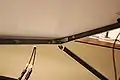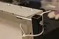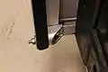 The top panel (the reinforced one connected to the cart) has two square steel tubes attached to the bottom corner of it(see Figure 10.) At the other end of each steel tube is a thick 4" bolt (see Figure 11.) There are three holes at the base of either side of the cart that the bolts easily slide into (see Figure 12.) The holes were drilled out to hold the panels at 0°, 20°, or 30°. There are two legs attached by "L" brackets to the underneath of the other panel's frame (see Figure 13.) The legs were constructed of three pieces of slotted angle bar so they could be adjusted to different heights for the different angle settings. They automatically drop down when the panels are unfolded.