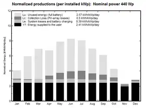When modeling a photovoltaic system there are many losses which have to be taken into account other those relating to weather. There is a certain amount of unused energy that is simply unused due to over sizing the system. The two Shuco solar modules provide approximately 44% more power than what the batteries are able to store. Smaller modules or less battery storage could have been implemented to reduce waste however due to materials costs and system voltage. The two panels were needed to ensure power production for the year and batteries were selected based on price and capacity. For losses which occur in a system which exclude weather contributions, see Figure 6.