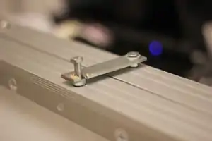 On the opposite end from the piano hinge, install some sort of locking system, so the bottom panel stays locked in place when not being used. This can be done with a peice steel bolted onto the top panel at one end, and a hole drilled into the other end, with an opening to allow it to pivot around a bolt place on the other panel. See figure 22.