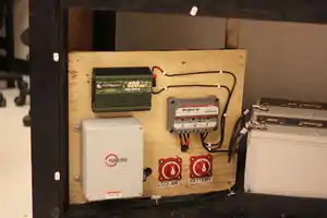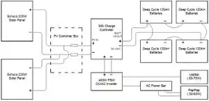 The components (charge controller, inverter, combiner box, and battery switches) can be mounted, and wired to the component board next. The component board is both for ease of use, and because the charge controller must be mounted vertically to function properly. See figure 3, for a possible layout, and figure 2 for a wiring diagram.