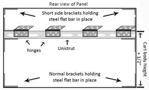 Once the batteries are on the cart, the panels can be put on. The first is to reinforce the top panel with steel flat bar. use two full length 'L' brackets in the bottom corners, and the two shortened brackets in the top corner, with the short ends pointing downward, see figure 20. Measure the height of the cart from the top of the wheel to the top of the cart. Measure that distance from the bottom of the top panel upward, adding an extra 1/2" for clearance. That will mark the top of where the unistrut support bar goes. Connect the four heavy duty hinges to the unistrut as in figure 20, making sure the distance between the outer two hinges is just less than the length of the cart.