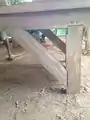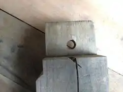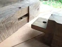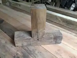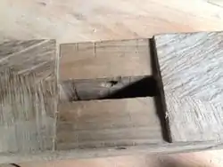This is the tenon piece. The tenon is inserted into the mortise. The part that fits into the mortise has a smaller width than the rest of the timber, because of the square rule (described above table). Only two sides of the timber are square, but the four sides of the tenon are made square by slightly reducing its size. A flat notch is made in the mortise piece (shown below) that is just big enough to fit the tenon piece. |
