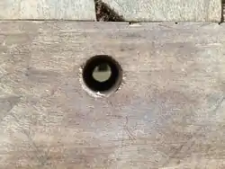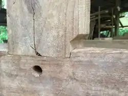A hole is drilled into the tenon that will be slightly above the holes drilled into the mortise by about 1/8". Holes are also drilled into the mortise. The holes should be about 1/8" below the tenon hole. This 1/8" offset is to ensure that when the peg is hammered into the holes the mortise and tenon pieces are pulled together by the peg. If they were offset in the opposite direction than the weight of the structure would rest on the peg rather than the frames, which would make it a very fragile joining. |