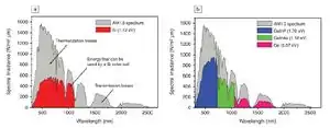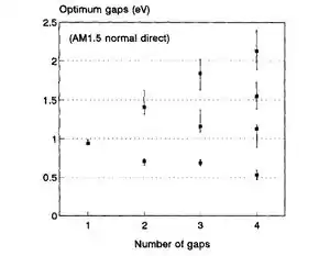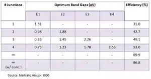Multi-junction (MJ) solar cells use multiple semiconductorW layers (subcells) to produce electricity at high operating efficiencies. Each layer has a unique band gapW designed to efficiently absorb a specific segment of the solar spectrumW. This has two important advantages over single-junction (SJ) devices: a wider range of absorption of incident photonsW as well as a more effective energy extraction from these photons. The lowest band gap of a MJ cell will be lower than that of a typical SJ band gap. Therefore, the MJ cell can absorb extra photons that possess less energy than the SJ band gap but greater than its own lowest band gap. The MJ cell will absorb the same photons more efficiently since having band gaps closer to the photon energy will reduce thermalization losses. For example, a SJ band gap of 1 eV could extract only 1 eV from a 3 eV photon with 2 eV wasted via thermal decay. On the other hand, a MJ cell with a top band gap of 2 eV will extract twice the energy from the same photon. Figure 1 illustrates the difference in energy absorption between a triple MJ cell and a SJ cell. The colored areas show the amount of energy that can be extracted by each cell. Table 1 gives the optimum band gaps and corresponding efficiencies for MJ cells. The table illustrates how additional junctions raise maximum efficiency. However, adding junctions also increases the device's complexity and cost. It must be noted that the use of concentrators gives an additional boost to potential efficiency.