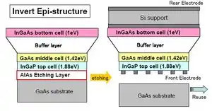 Additionally, there are two main strategies employed to reduce this lattice mismatch effect. The first involves using a buffer layer between two lattice-mismatched materials to match the lattice constants. This buffer layer is typically step-graded meaning its lattice constant is slowly altered by changing the composition so that either end of the buffer layer matches its adjacent subcell. The second method uses an inverted growth method to avoid lattice mismatch effects if the top layers are matched but the bottom layers are not. The growth process is reversed starting with the top layer (widest band gap) and adding subsequent layers. The substrate the top layer was grown on is then etched off after wards. Figure 6 shows the process for a triplet MJ cell for lattice matched top (InGaP) and middle (GaAs) layers with a lattice mismatched bottom cell (InGaAs).