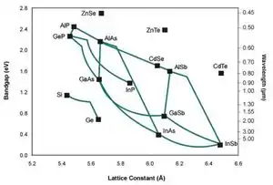 In monolithic MJ devices, each semiconductor layer is grown on top of one another. However, if the lattice constants of the crystals in adjacent layers do not match this will result in lattice strain and potentially dislocations. These dislocations cause defects to form in the crystal structure leading to unwanted recombinations and subsequently a decrease in cell efficiency. For this reason, it is advantageous to select semiconductor materials that have matching or closely similar lattice constants. Figure 5 shows a list of common MJ semiconductors and their lattice constants. The turquoise lines indicate the lattice constants for mixtures of the two connected materials.