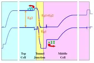 In monolithic cells, the positive and negative contacts are situated on the top and bottom of the cells. As a result, photogenerated carriers produced in the middle semiconductor layers must travel through multiple layers without recombining to reach the contacts. This is one additionally difficulty associated with MJ cells. Tunnel junctions, heavily doped regions connecting the n and p terminals of adjacent layers, are used to aid this carrier transportation. These p-n junctions (typically double hetero junctions) are made with the aim of minimizing electrical losses (voltage drops) as well as optical losses (photon absorption). The latter is done by using wide band gap tunnel junction materials to allow the photons to pass into the lower layers. However, this makes obtaining high tunnelling peak current difficult so thinning the depletion layer by means of a highly doped (>1019 cm -3 ) junction is necessary. This design promotes quantum tunneling and yet also serves as an effective potential barrier for minority carriers. However, the exact physics behind quantum tunneling are not yet fully understood. Figure 4 on the right shows the band diagram of a double hetero tunnel junction.