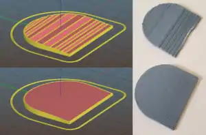 Nonplanar printing, in 3d printing, refers to printing parts that use layers where the nozzle is moved in both the [x,y] and z axes to create curved surfaces, as opposed to using discrete layers in the z axis. This allows very smooth layers to be generated, especially in low-angle geometry where stair-stepping is apparent. An example is shown to the right.