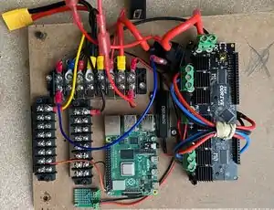 - Secure the components listed above to the main electronics board using M3 Nylon Standoffs for the O-Drive Motor Control Board (x4), M5x10 screws for the 5V Regulator (x2), M4x10 screws for the largest rail (x2), and M2.5x10 screws for the rest of the components (x14).
