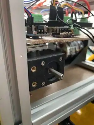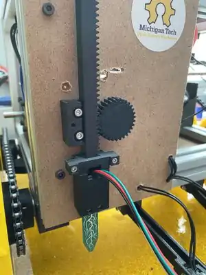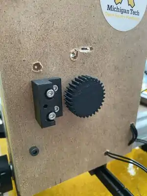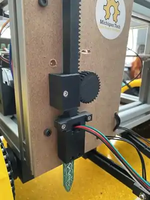 - Install M3 heat insert. Attach PinionGear with M3 setscrew. Attach SensorRackTrack with two M3x10 bolts.