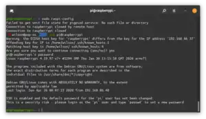 Now that you have the IP address, or hostname, of your raspberry Pi, you can ssh into it by issuing the following command into your terminal on Mac or Linux ssh pi@raspberrypi Here, you would replace "raspberrypi" with the IP address found in the last section if your router is unable to automatically resolve the hostname of the Raspberry PI. If you are on Windows you will need to use a program called PuTTY. With Putty, you should just have to enter the IP address or hostname. If working with a raspberry pi 4, you must first enable ssh in start menu>preferences>raspberry pi configurator. Then once the window with a black background pulls up, it will prompt you to enter in a username pi (by default set this way), and then a password raspberry (again, set to this by default) Passwords will not be visible while typing, but do not worry your keystrokes are being entered.