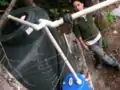 We tested our rainwater catchment system by placing a running hose into the gutters attached to the roof. We discovered that the water flows from the gutters to the first flush tank, but due to the high flow from the hose (which could easily be replicated by a storm) some water ran past the first flush tank into the main storage tank. We redesigned the diversion configuration to rectify this problem. The only other issue that can easily be fixed is that some of the water running into the sediment extraction bucket shoots past the bucket onto the roof. We fixed this problem by adjusting the bucket's placement on the roof.