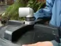 We measured a smaller hole and drilled into the side of the 15 gallon first flush tank. To get the plastic threaded tube inside the tank without losing it, we used a string, washer, magnet and a telescoping magnet pen to thread this piece through the tank into the opening we drilled. We placed a nut and gasket on either end of the threaded tube. Once we got the threaded tube through the hole and in the correct position, we tightened the nut/gasket with channel locks then used silicon to seal the opening and make it water-proof. At this point, we attached the plastic threaded gate valve to the threaded tube. These components make up the slow-release drip valve that will gradually let water out of the first flush system. At the top of the first flush tank, we reduced the opening to allow for PVC connection. Our primary design for the diversion of the first flush allowed some of the wash water to pass into the main storage tank. We rectified this by redesigning the T-junction (see pictures below).