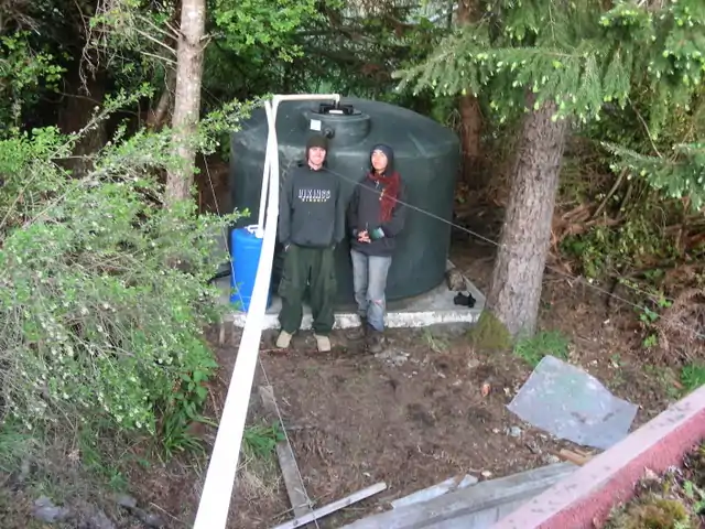 - Once the 1550 gallon main storage tank fills to the brim, the excess water is diverted through overflow tubing downhill behind the main tank into the woods