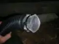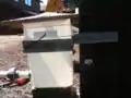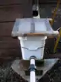 We measured and drilled a hole into the side of the 4 gallon square bucket. For inside the bucket, we pieced together one 90 degree PVC elbow into a 6 inch piece of 1-1/2 inch PVC pipe, fit another 90 degree elbow onto the 1-1/2 inch PVC piece and connected this piece to a reducing rubber coupler. The rubber coupler was the piece that connected the inside PVC components to the PVC tubing outside of the bucket. We made sure to silicon both inside the bucket as well as outside the bucket to seal the openings to prevent water from leaking. To secure the bucket from environmental factors such as wind, we used a 4-foot strip of flattened sheet metal and crafted it for the purpose of holding the bucket to the house. We used a drill and screws to attach the sheet metal and bucket to the house. We also set the bucket on 2 levels of brick as well as a piece of 1-inch thick scrap wood to allow enough head from the roof catchment to the main storage tank. In order to have the water flow directly into the sediment extraction bucket, we had to cut the downspout with a hacksaw and reposition it to line up with the bucket.