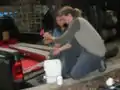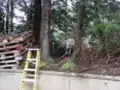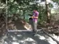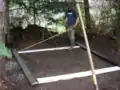 After clearing the slab site, we started on the slab preparation. We built an 8-foot by 8-foot wooden frame for the concrete slab out of wood and nails found in the shop on site; we made sure that the ground was level for the frame to sit on by using string and a level. We filled the inside of the frame with rock and sand. The frame was designed to create a 4-6 inch slab. The frame was rebared and poured by a local contractor at the same time as a larger concrete driveway was poured at Old Growth Cellars.
