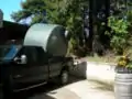 We transported the main storage tank from Resale Lumber in Eureka, CA and moved it from the truck to the correct position on the concrete slab. Next we assembled the various components that will connect the opening at the bottom of the main tank to a garden hose to access the stored water. To the top opening of the tank, we attached the rubber flexible coupler and a 90-degree PVC elbow to the coupler; these pieces connect to the PVC that runs from the first flush system to the main tank. The overflow tubing was attached to the main tank and a screen was attached to the end of the tubing to prevent unwanted guests from entering the tank.