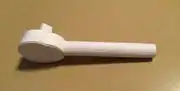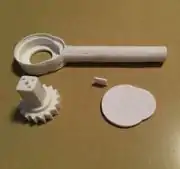 - First, take note that there is a small opening and a large opening on the ratchet. Inside the large opening is a small rectangular inlet, this is where the gear pin is placed. As mentioned in the "Tools needed..." section above, super glue can be placed on the gear pin and inlet to attach the gear pin to the ratchet. Next, the block on the ratchet gear is placed through the small opening of the ratchet starting from the large opening. Lastly, the ratchet cover is placed over the large opening of the ratchet to cover up the parts inside the ratchet.