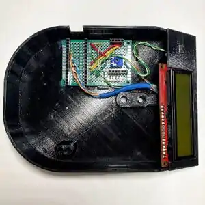 If you haven't already, secure the LCD in its slot on the housing, directing the wires around the boss for the load cell. If any wires rest in contact with the load cell, reliable measurements will be impossible. Secure the breadboard in place, being sure that the USB port on the Arduino Nano (which will go on the 2 sets of 15x1 headers) will be accessible. If the breadboard isn't sitting tightly, secure it down with hot glue on two or three corners.