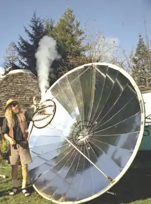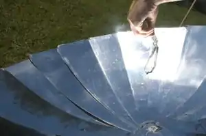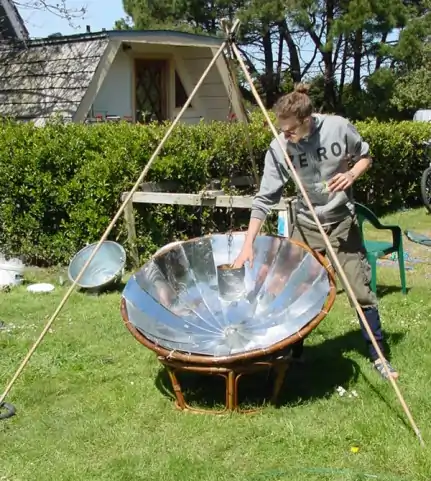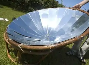 A solar cooker is used to concentrate sunlight onto a pot or dish. It can be used to bake, fry, make popcorn, cook rice, light fire, sterilize and boil water. This has potentially important applications in sun soaked areas where fuel for cooking is scarce, or where women must travel farther and farther from their villages to gather wood as fuel becomes more scarce. If solar cooking catches on it, it would become a new style of outdoor recreation similar to the barbecue, but one that is directly connected to the world at large (ie the sun) and has no carbon footprint (if people reused their plates and silverware).