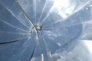 Now, look at the the facets; do they lie close to the frame? Does it look parabolic? Are the mirrors clean? If the facets float above the frame and look uneven, you may want to try the extra tie technique mentioned in the above "Reflector" section. This will allow for a better focus. If the mirrors are dirty, try using a small amount of citra-solv natural solvent and water on a rag to clean them.