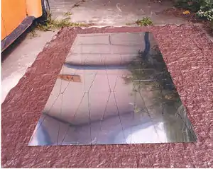 - This project ended up utilizing a previously-owned Anodized Polished Aluminum sheet donated by Bart Orlando. The sheet was previously cut into triangular facets with a plasma cutter for use in a different cooker some years ago. He purchased the 4'X 8' sheet new for $80, but professes that cheaper ones are periodically available at the local salvage yard.