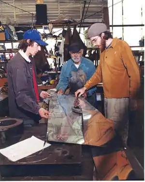 Local Solar Cooking expert and Appropriate Technology innovator Bart Orlando inspired and co-created this project. Bart offered his vision of the papasan chair solar cooker as a class project when he came to speak in front of the class at the beginning of the semester. Bart has been working with students in the Humboldt area for more than 15 years, building and designing pedal powered and solar powered prototypical educational displays. Working with Bart means that this project had the benefit of the innovative design that comes from years of experience. For more information on Bart's projects, visit these , , and Parabolic basket solar cooker web pages. Bart Orlando's main web page students wishing to start a project with him is entitled Projects With Bart.