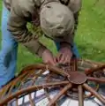 - 12" bike wheel rim with 3 hooks extending outwards at 120 degree angles. Unpainted coat-hanger wire woven in a grid on the inside of the rim would provide a flat grill-space for the cooking receptacle. The receptacle could be a tea kettle, frying pan, or cooking pot.