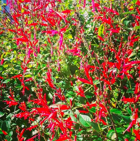 Pineapple sage has bright green leaves. It has bright red flowers that bloom from autumn to spring and even into summer, in milder climates. These flowers are tubular in shape and can be prolific when in full bloom.