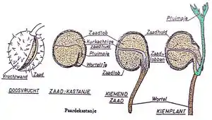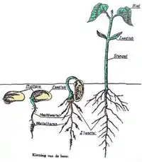 - method of germing: The root always first appears, it always grows downwards or it attempts to do so. After this, the stem appears, it is often first still bent in a sharp angle, then it will erect itself and the plume can grow. With the common bean, maple, and the spruce, the cotyledons appear above the soil surface and then usually fall off. This is called an epigeïc germination. With the pea, rye and horse chestnut, the cotyledons remain in the seed coat below the soil surface. This is called a hypogeïc germination.