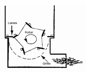 a. Horizontal axis grinders These grinders are made of a rapidly rotating horizontal cylinder on which knives are mounted. The shearing is done between these movable knives and fixed knives attached to the frame of the grinder. A grid, placed under the knives, determines the size of the grinded fragments. The plastic fragments remain in the grinding zone until their size is smaller than the perforations of the grid.