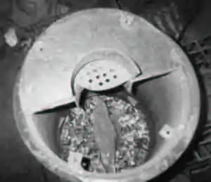 b. Vertical axis grinders The vertical axis grinders are much less efficient than orizontal axis grinders. Yet they are widely available in some countries because they are less expensive and easier to manufacture using traditional methods. Their design is actually simpler (see Figure 4.9). They consist of a cylindrical tub at the bottom of which knives revolve. The bottom of the tub consists of a perforated grid through which the plastic that is grinded enough can pass using gravity. The engine transmission is placed below the grid.