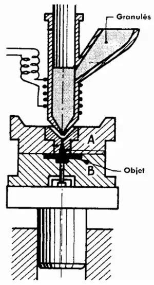 - An injection pot in which the material is plastic. The plastic material is introduced through a feeding hopper and it is gradually heated through contact with the walls of the pot. A piston ensures the transfer of the fluidized material towards the mold through a nozzle.